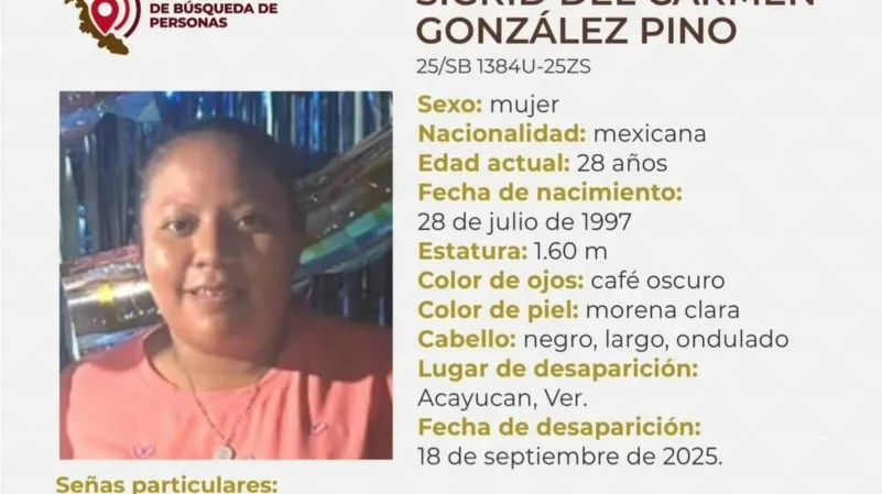 La Comisión Estatal de Búsqueda de Personas de Veracruz emitió una ficha para dar con el paradero de Sigrid del Carmen González Pino, joven de 28 años reportada como desaparecida desde el pasado 18 de septiembre en el municipio de Acayucan.