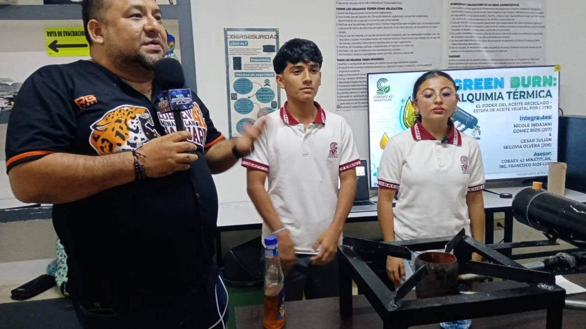 Bajo la asesoría del maestro Francisco Ríos, los jóvenes desarrollaron “Green Burn”, un proyecto que utiliza principios de termodinámica para transformar el aceite de cocina usado en una fuente de calor eficiente. El sistema funciona mediante un goteo controlado de aceite que, al interactuar con oxígeno impulsado por un ventilador, genera una combustión capaz de sustituir el uso de gas o leña.