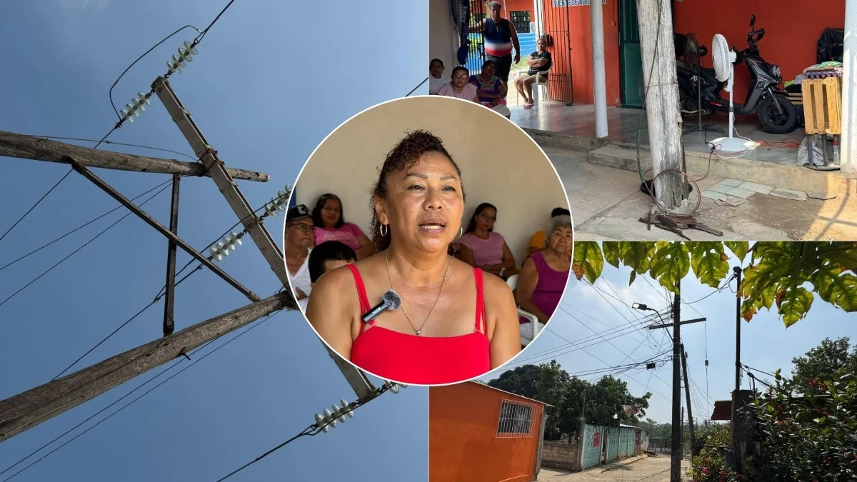 Yolanda Patraca Pérez, representante de los vecinos, denunció que las estructuras de madera —algunas con más de 45 años de antigüedad— han “tronado” y presentan inclinaciones peligrosas. El riesgo aumentó hace seis meses cuando un rayo impactó uno de los postes, obligando a los vecinos a aplicar cemento de forma rudimentaria para intentar sostenerlo.