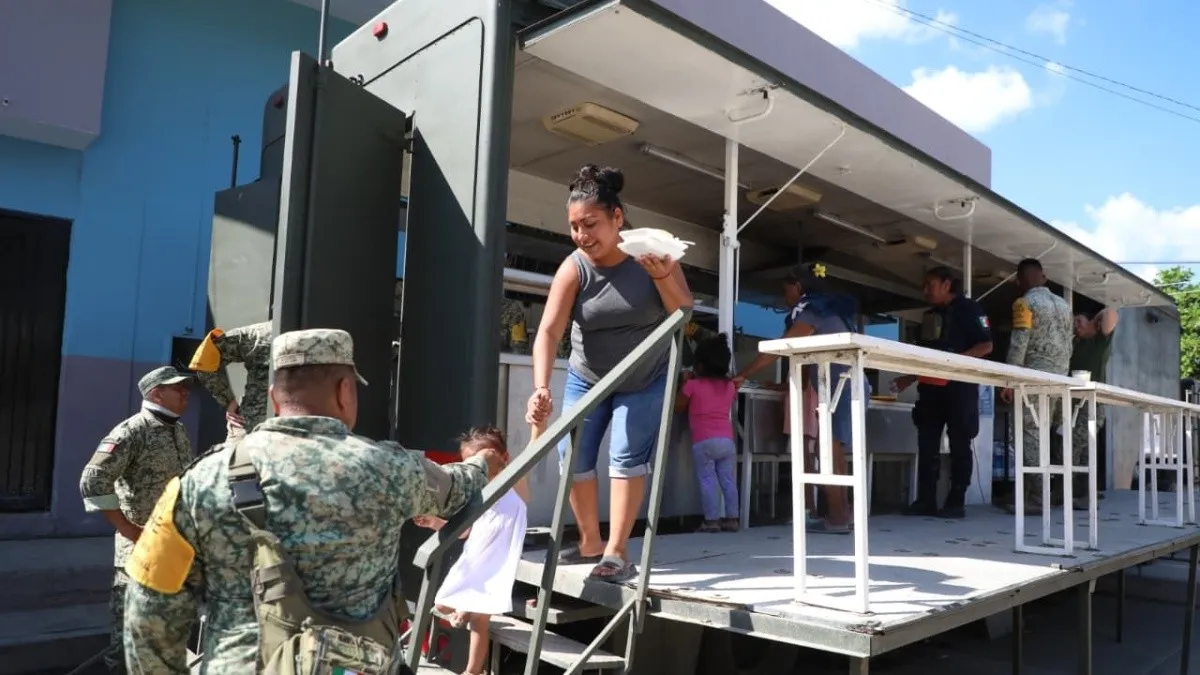 Con la Secretaría de la Defensa Nacional y la empresa Bachoco, la cocina móvil instalada en el municipio prepara y distribuye más de mil raciones de alimentos calientes entre desayunos y comidas, que son entregadas directamente en los hogares y comunidades más afectadas.