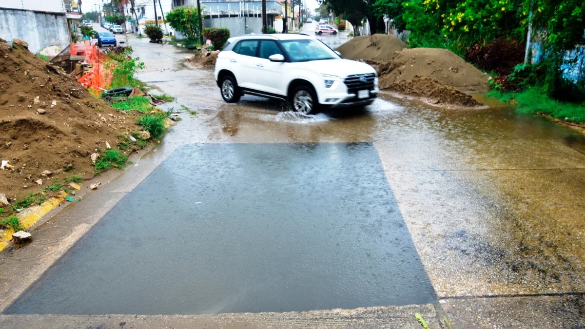 Lo que por meses fue un peligro latente para los residentes de la colonia Petrolera, este lunes se transformó en una verdadera trampa mortal. El hundimiento de losa localizado en el cruce de las calles Chihuahua y Veracruz quedó completamente cubierto por los encharcamientos que dejó el frente frío número 43, volviéndose imperceptible para quienes transitan por la zona.