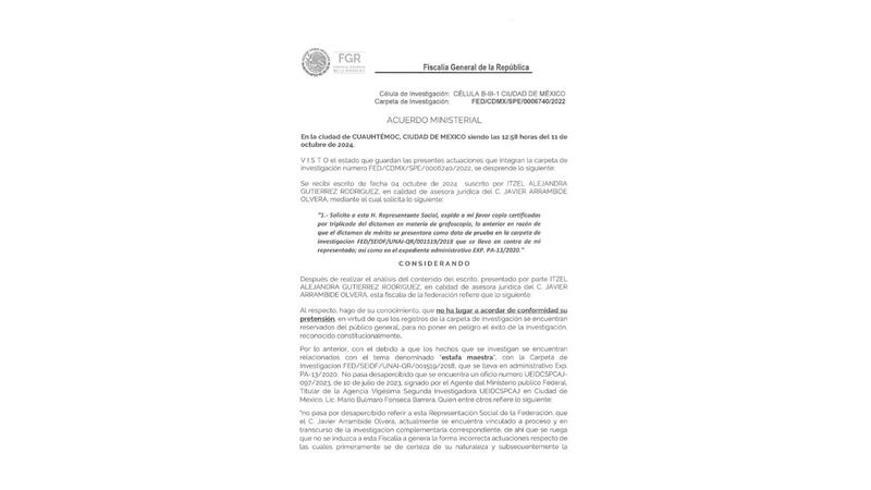 Hasta agosto de 2024, un año y ocho meses después de que un perito oficial pudo revisar el documento “original”, resguardado por la FGR y en el que se basa la acusación hecha por el MP Mario Bulmaro Fonseca en contra de Javier ‘N’ y José Luis ‘N’.