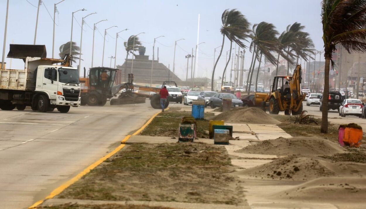 Las labores de limpieza se realizan con apoyo de maquinaria pesada y camiones de volteo, luego de que el fuerte oleaje y las intensas rachas de viento arrastraran grandes cantidades de arena, ramas, troncos y otros residuos naturales hacia los carriles de circulación del bulevar costero.