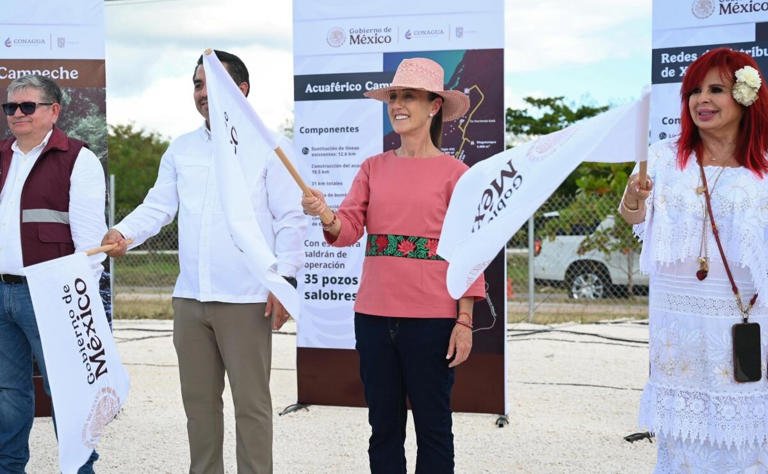 Acompañada por la gobernadora Layda Sansores, la jefa del Ejecutivo federal indicó que dentro del proyecto “Agua para Campeche” se construirá una batería de pozos a 30 kilómetros de la ciudad de Campeche, un acueducto y seis tanques de almacenamiento para sustituir los actuales pozos que ya suministran agua salitrosa.