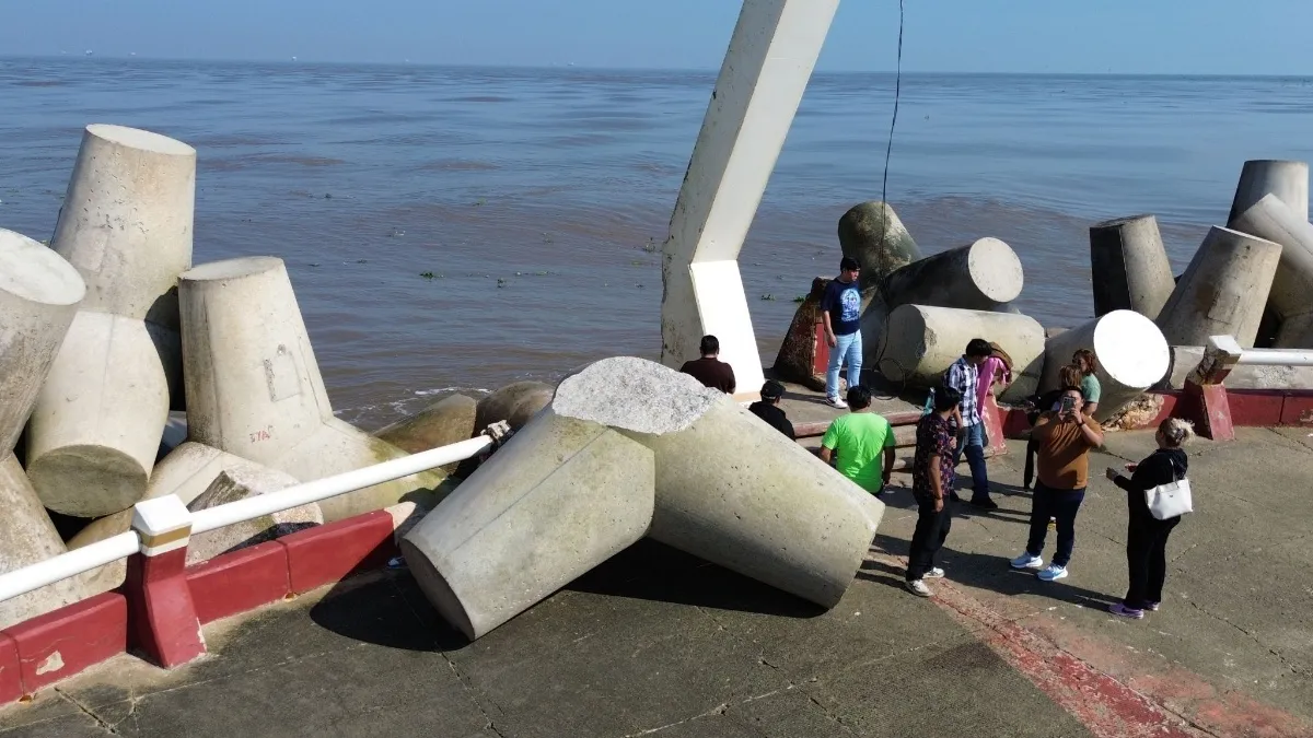Los efectos del frente frío número 25 provocaron el desplazamiento de un tetrápodo hacia el interior del paseo de las escolleras de Coatzacoalcos, situación que llamó la atención de los visitantes.