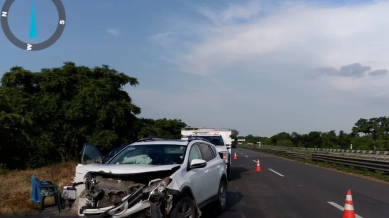 El primer percance ocurrió a la altura del kilómetro 2+100, donde una camioneta Toyota Hilux, color gris y con permisos provisionales de circulación, colisionó contra señalamientos de acordonamiento por trabajos de obra, y terminó fuera de la cinta asfáltica tras salir hacia la cuneta central.