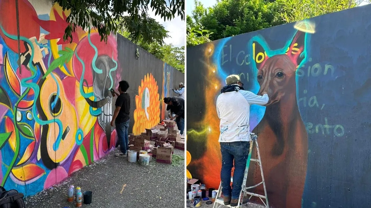 Más de 40 integrantes de la agrupación Razas Unidas Expresándose participan en este proyecto, que abarca los muros ubicados sobre las avenidas Miguel Hidalgo e Ignacio Aldama, donde plasman murales con diversos temas alusivos al Día de Muertos, como parte de una iniciativa de recuperación urbana.