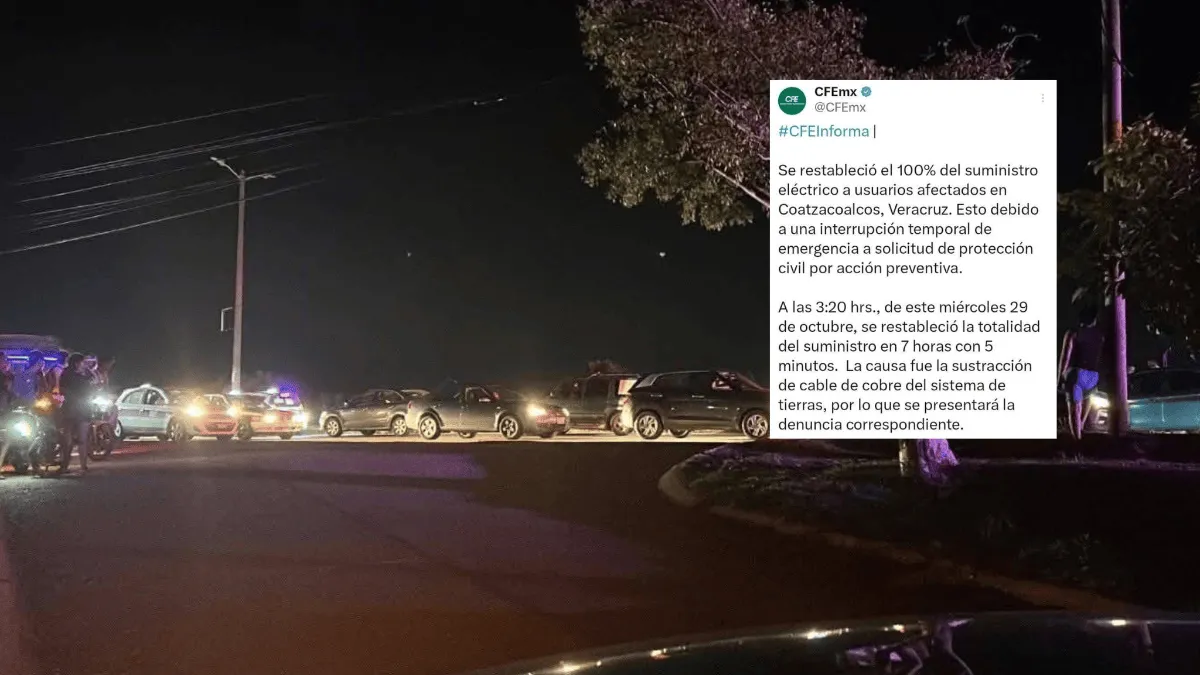 “Se restableció el 100% del suministro eléctrico a usuarios afectados en Coatzacoalcos, Veracruz. Esto debido a una interrupción temporal de emergencia a solicitud de Protección Civil por acción preventiva.