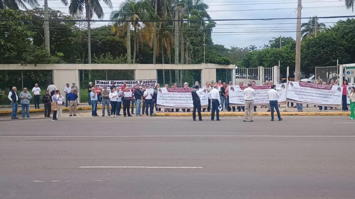 Un grupo de trabajadores de la UNTYYPP, jubilados en su mayoría, protestaron pacíficamente afuera de la entrada del Edificio Inteligente de Pemex Petroquímica, ubicada sobre la avenida Universidad Veracruzana, a un costado de la colonia Rafael Hernández Ochoa.